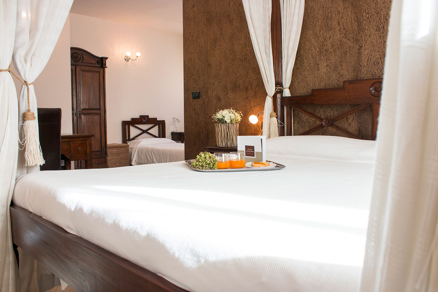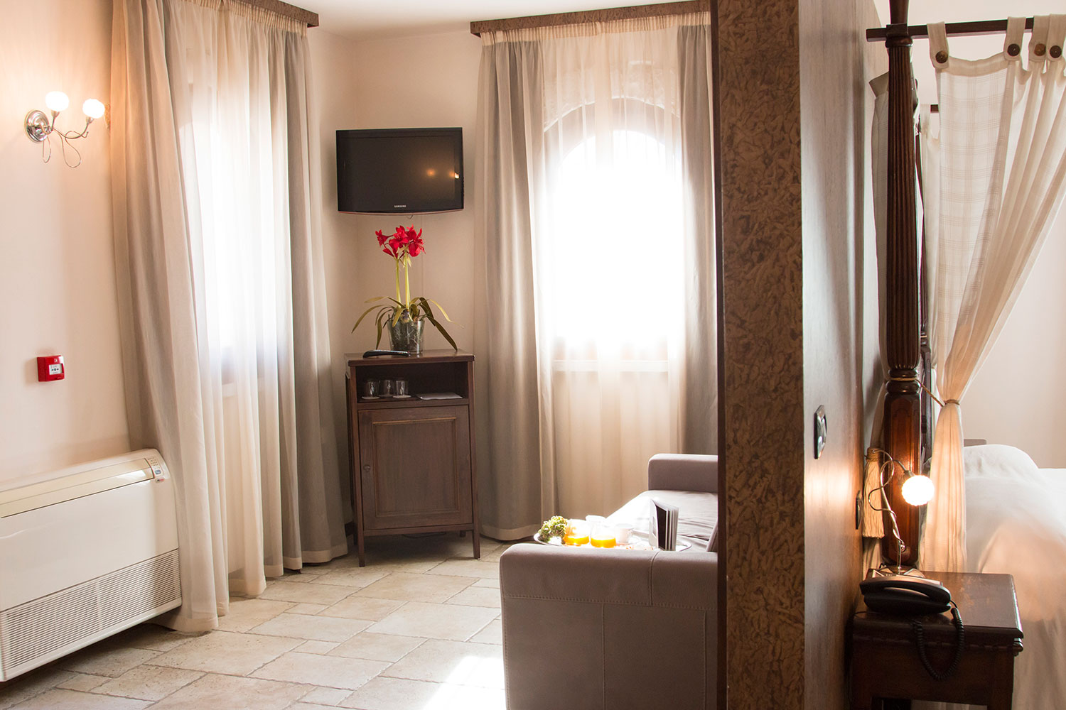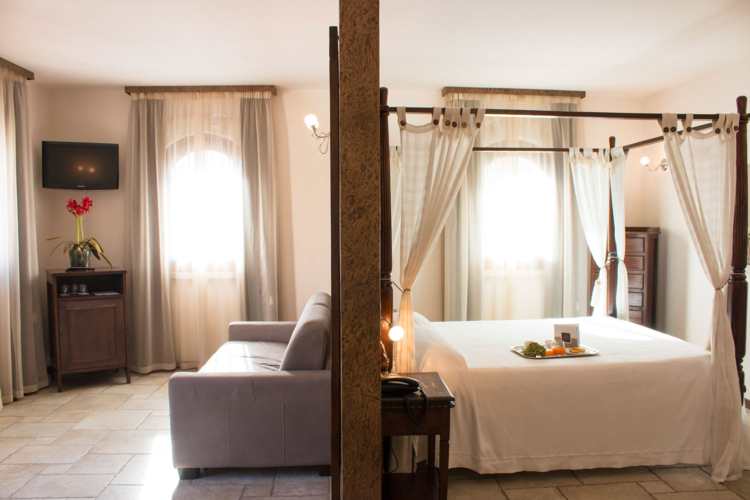 Connessione wi-fi e utilizzo del minibar gratuito. “Eleganti…” si affacciano nell’antica corte da cui potrai godere l’atmosfera del luogo; letto a baldacchino, una ampia zona relax con divano, televisore LCD e la sala da bagno finemente rivestita in marmo vi accoglieranno.