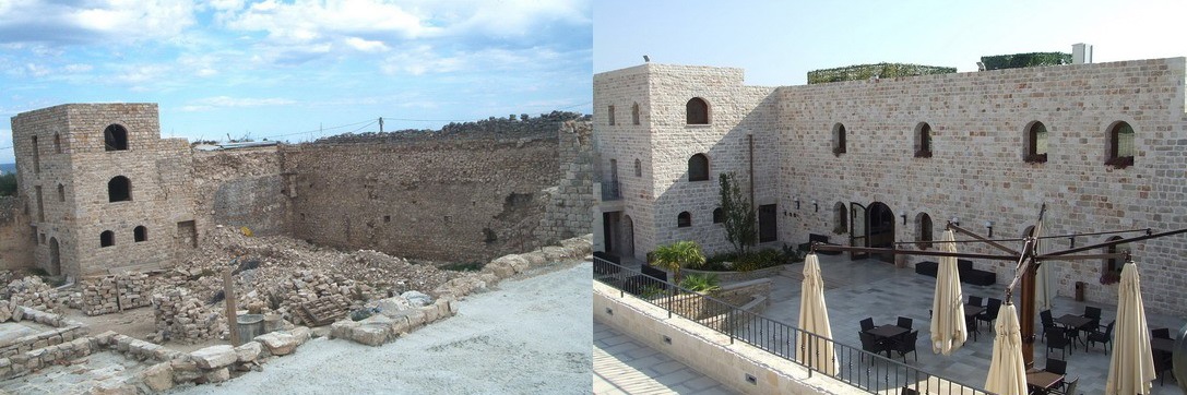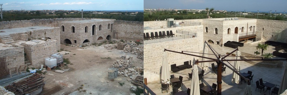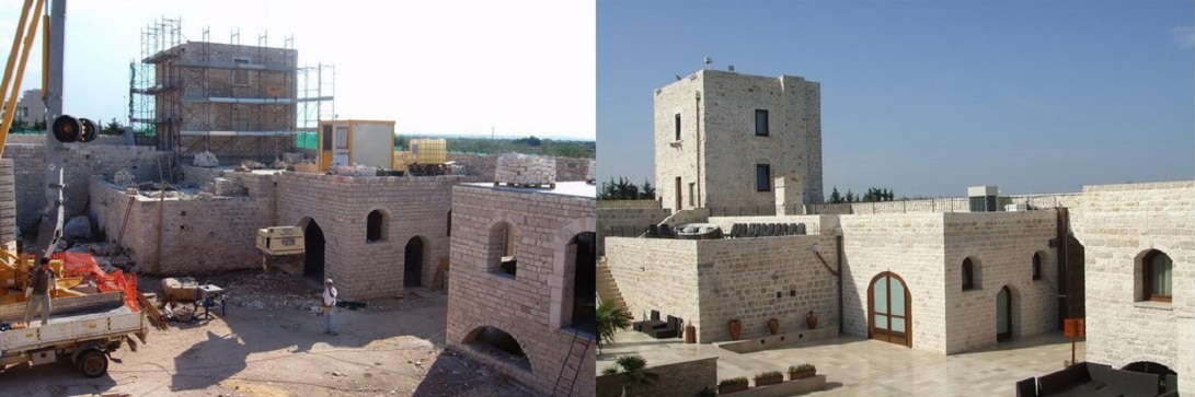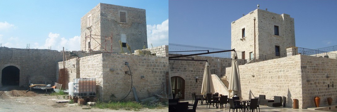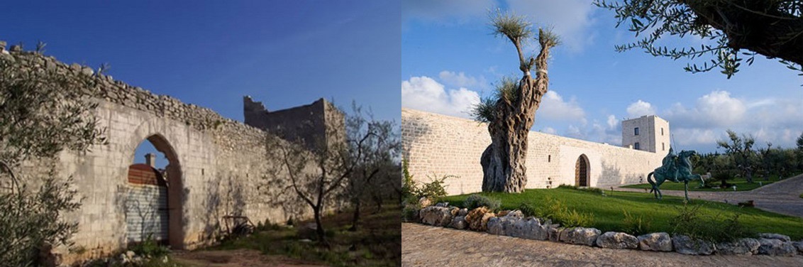 Il portale che si apre nella cinta muraria, presenta tracce di architettura araba con capitelli lavorati ed arco a sesto acuto; le due robuste torri di vedetta e l’interno lunettato di una chiesetta romanica, dedicata al Santo patrono di Bari, con eleganti monofore all’esterno raccontano la storia con autenticità ed eleganza.